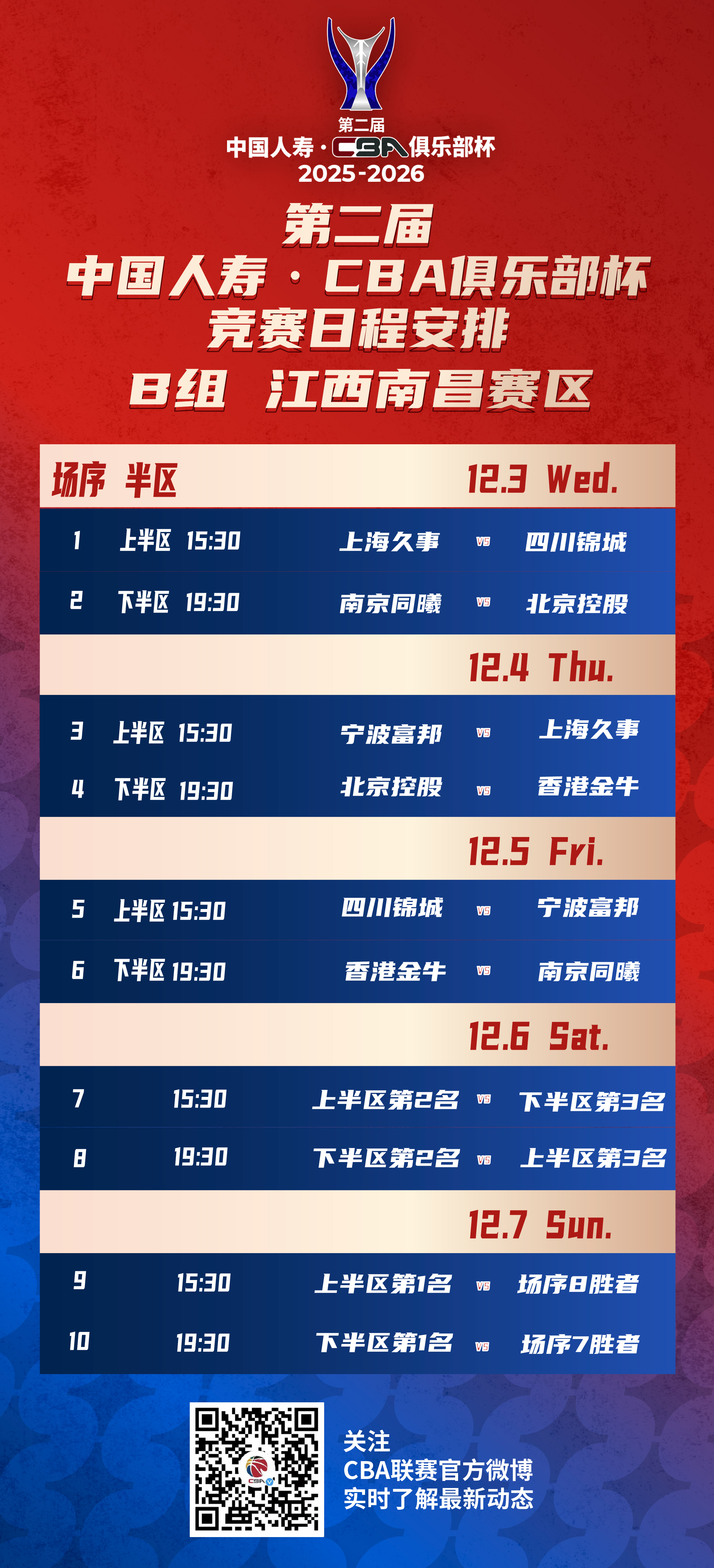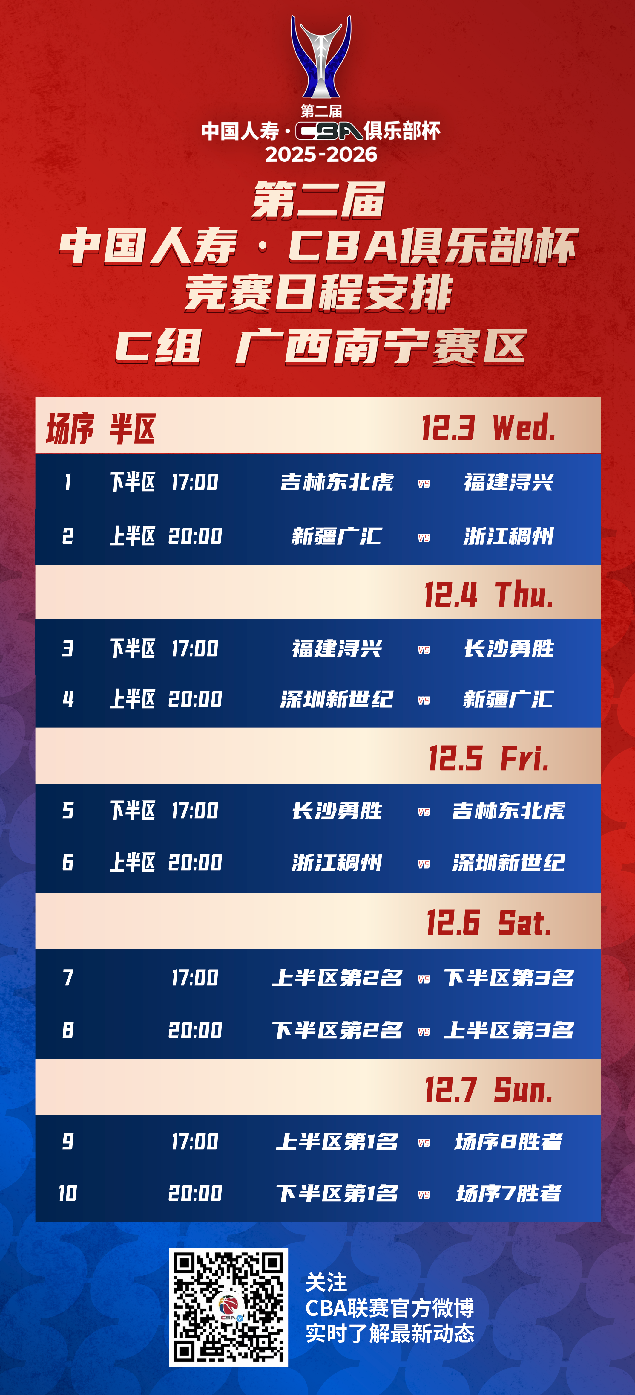 第二届中国人寿·CBA俱乐部杯小组赛将于2025年12月3日-8日在湖南长沙、江西南昌、广西南宁和湖北武汉四个赛区进行,小组赛赛程现已火热出炉!